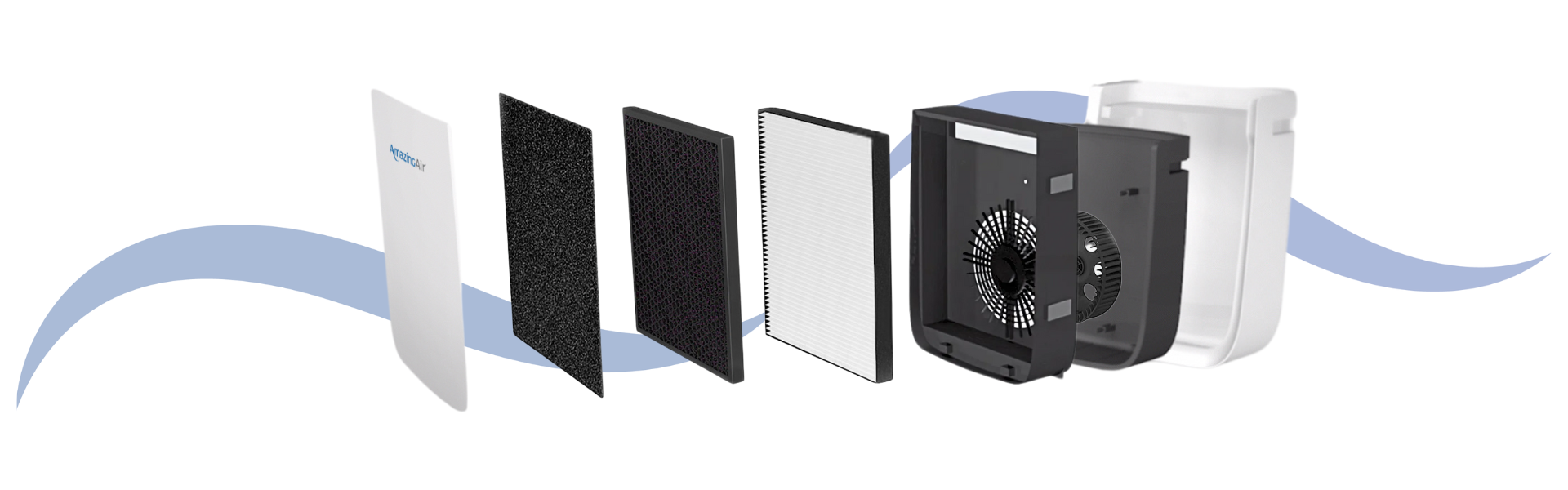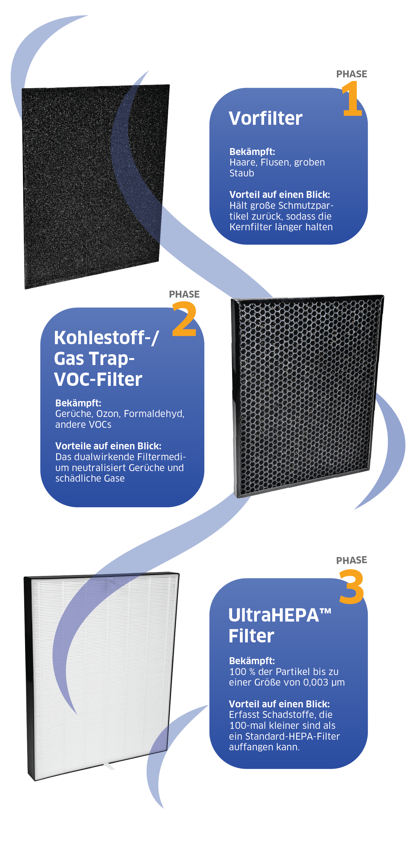 AmazingAir kombiniert einen UltraHEPA™-Filter mit intelligenter Luftstromtechnik, um sowohl Partikel als auch Gase schnell und leise zu beseitigen. Siehe hier wie jede Filterschicht funktionert: